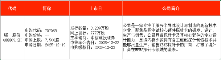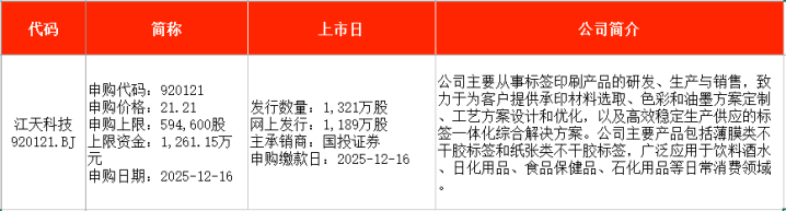 从时间表看,健信超导(688805)将在本周一(12月15日)申购;江天科技(920121)将在本周二(12月16日)申购;誉帆科技(001396)、强一股份(688809)、双欣环保(001369)等均将在本周五(12月19日)申购。