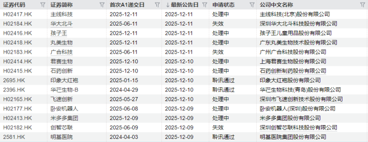 其中,主线科技(北京)股份有限公司、孩子王儿童用品股份有限公司、广东丸美生物技术股份有限公司、上海君赛生物股份有限公司、石药创新制药股份有限公司、米多多集团股份有限公司等6家公司为首次递交。